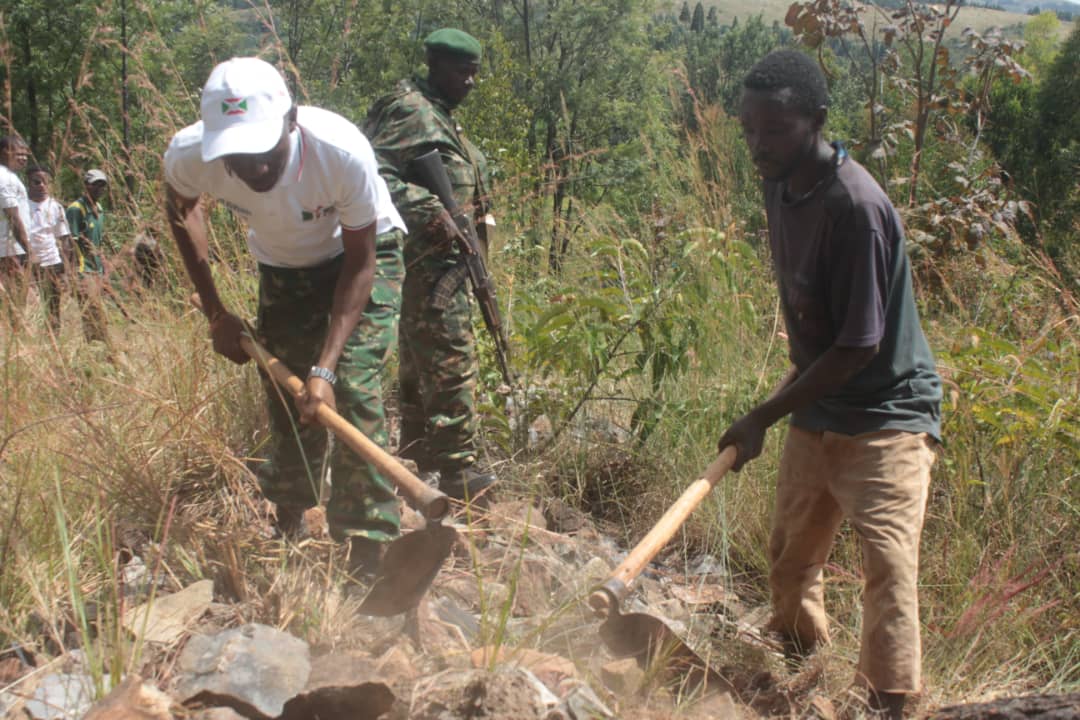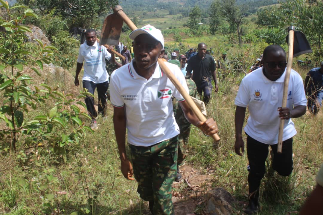 CANKUZO ( Commune CANKUZO), 3/06/2021 – Lieutenant-Général NIYONGABO Prime, Chef d’Etat Major de la Force de Défense Nationale du Burundi (FDNB), participait, en colline MAKANO , aux TRAVAUX DE DEVELOPPEMENT COMMUNAUTAIRE [ TDC – http://bdiagnews.com/TDC ], consistant à sarcler autour des arbres plantés, cadrant avec le projet national « EWE BURUNDI URAMBAYE » de LA POLITIQUE ENVIRONNEMENTALE DES BARUNDI.