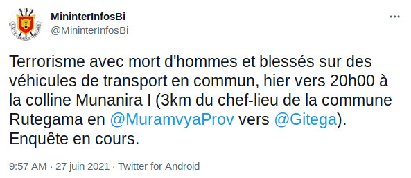 MURAMVYA ( Commune RUTEGAMA ), 26/06/2021 – La POLICE NATIONALE DU BURUNDI (PNB) a informé qu’ un groupe terroriste a organisé une embuscade sur des bus de transport en commun à MURAMVYA, vers 20h00, en colline MUNANIRA I. MURAMVYA est une province frontalière de GITEGA, capitale du BURUNDI.