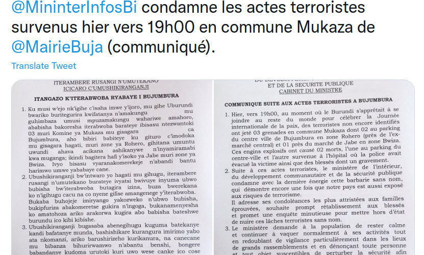 BUJUMBURA ( Commune MUKAZA ), 21/09/2021 – Le Ministère burundais de l’Intérieur a informé d’un acte terroriste meurtrié. Survenu lundi 20 septembre 201 à 19H en zone BWIZA. S’agissant de 3 jets de grenades sur des civils innocents, armes de traîtres : 2 grenades lancées au parking du centre ville de BUJUMBURA en zone ROHERO ( près de L’EX- MARCHE CENTRAL ); et 1 grenade au quartier JABE, à côté du MARCHE DE JABE. Occasionnant 2 morts et de nombreux blessés, évacués dans les hôpitaux de la localité.