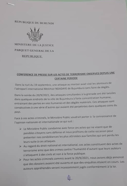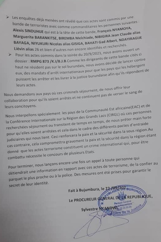 GITEGA, 22/09/2021 – Suite aux ACTES TERRORISTES commis sur le sol burundais touchant de nombreux paisibles citoyens [1]. M. NYANDWI Sylvestre, Procureur Général de la République, vient d’animer une conférence de presse [ https://www.burundi-forum.org/wp-content/uploads/2021/09/bdi_burundi_terrorisme_LeProcureurGeneraldelaRepublique_lance7mandatsdarretsinternationaux.pdf ]. Condamnant « avec force » les attaques du 19 septembre 2021 qui ont visé l’aéroport Ndadaye Melchior et celles simultanées du 20 septembre 2021 à BUJUMBURA. Et annonçant avoir émis 8 Mandats d’Arrêt Internationaux. Visant des citoyens Burundais vivant majoritairement en BELGIQUE ou en FRANCE, mais aussi au RWANDA [2]. S’agissant de : M. SINDUHIJE Alexis ; M. NYAMOYA François ; Mme BARANKITSE Marguerite ; M. BIREMBA Melchiade ; M. NIBIGIRA Jean-Claude alias (BAYAGA); M. NIYUKURI Nicolas alias (GISIGA); M. BAHATI Gad Albert ; et M. NDAYIRAGIJE Liévin.