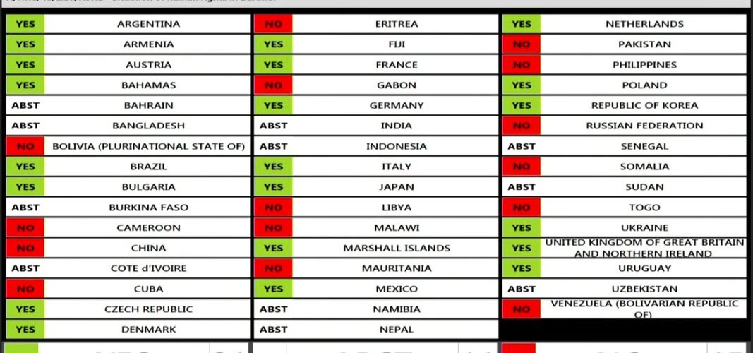 Malgré une diplomatie corruptible de l’ombre menée de manière intensive par ces derniers, le vote a été sans appel : AUCUN PAYS DU CONTINENT AFRICAIN n’a voté POUR. Seul les pays de L’UNION EUROPENNE (UE) en solidarité négative ont voté POUR.