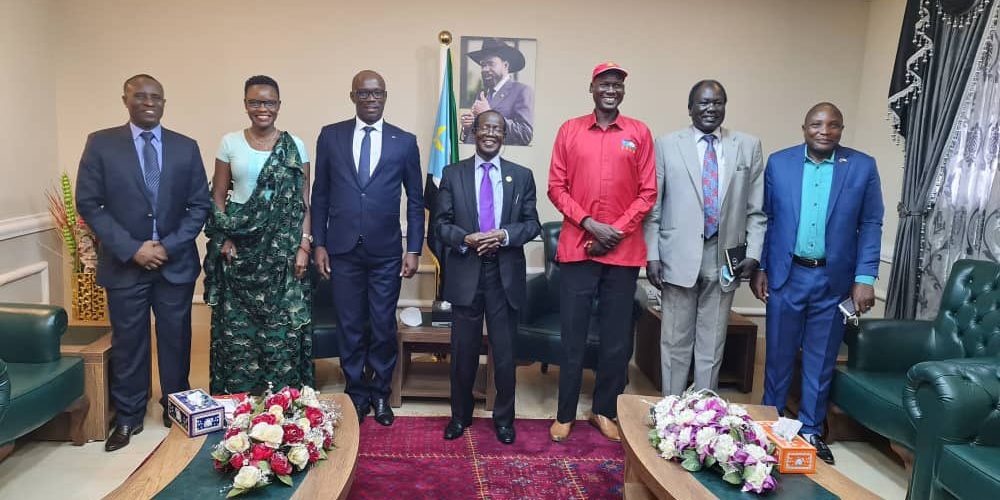 SUD SOUDAN, 3/11/2021– Accompagné en voyage au SUD SOUDAN des membres de son bureau. L’Hon. NDIKURIYO Réverien, Secrétaire Général du CNDD-FDD, a rencontré l’Hon. WANI IGGA James, Vice Président du parti Sudan People’s Liberation Movement – SPLM. S’étant rendu auparavant au mausolée du Dr GARANG John, Fondateur de la nation Sud Soudanaise. Y déposant une gerbe de fleurs en signant dans le Livre d’Or. Louant le courage de ce grand héros. Visitant aussi le stade de JUBA en construction. Rencontrant les responsables de la fédération de football au SUD-SOUDAN.