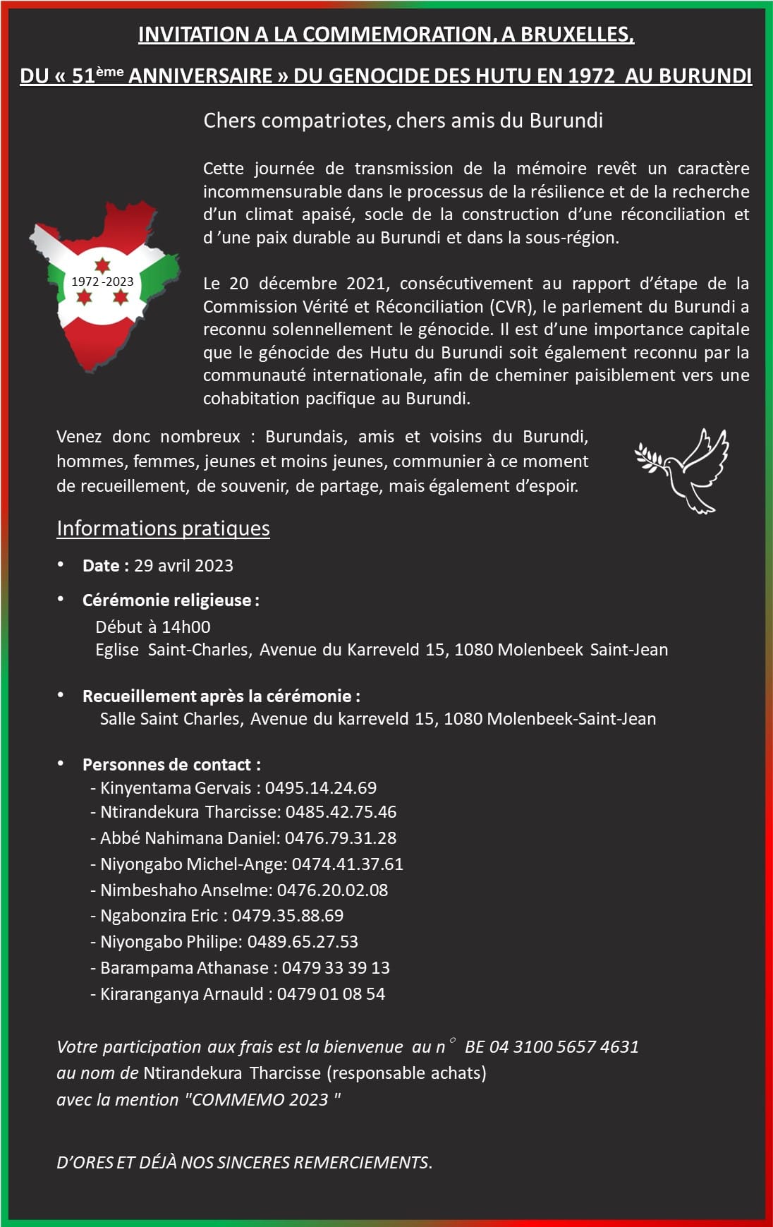 Bruxelles ( Belgique, Capitale de l’Union Européenne ), 29/04/2023 – En présence d’un corps diplomatique du Burundi conduit par le très apprécié ambassadeur du Burundi en Belgique, l’éminent ambassadeur Ntahiraja Thérence et son équipe, la diaspora burundaise de Belgique a solennellement commémoré les 51 ans depuis l’assassinat infâme du Mwami d’Ingoma Y’uburundi, Ntare Ndizeye Charles, dans le tristement célèbre régicide du Burundi, ainsi que le génocide contre les Bahutu du Burundi de 1972-1973, qui a entraîné plus de 1,5 million de victimes, sur une population de près de 3 millions de citoyens. Deux cérémonies distinctes, organisées respectivement par des personnalités de la communauté Baganwa de Belgique et des citoyens Barundi tels que M. Kinyentama Gervais , M. Ntirandekura Tharcisse, etc. ont été tenues à cette occasion.